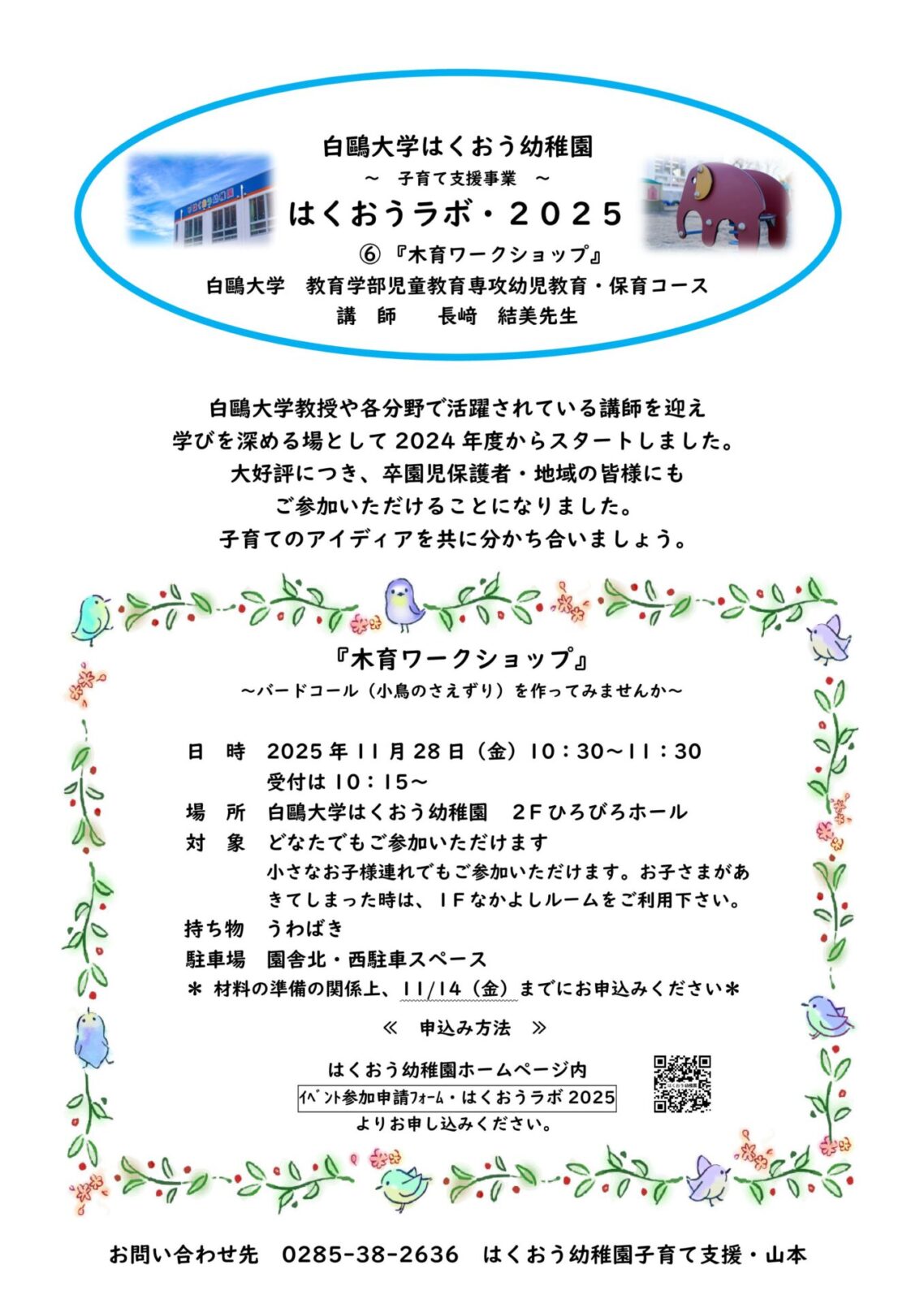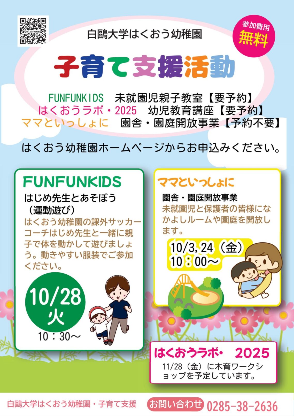 はくおう幼稚園へのお問い合わせは、お電話にて下記番号へお願いいたします。